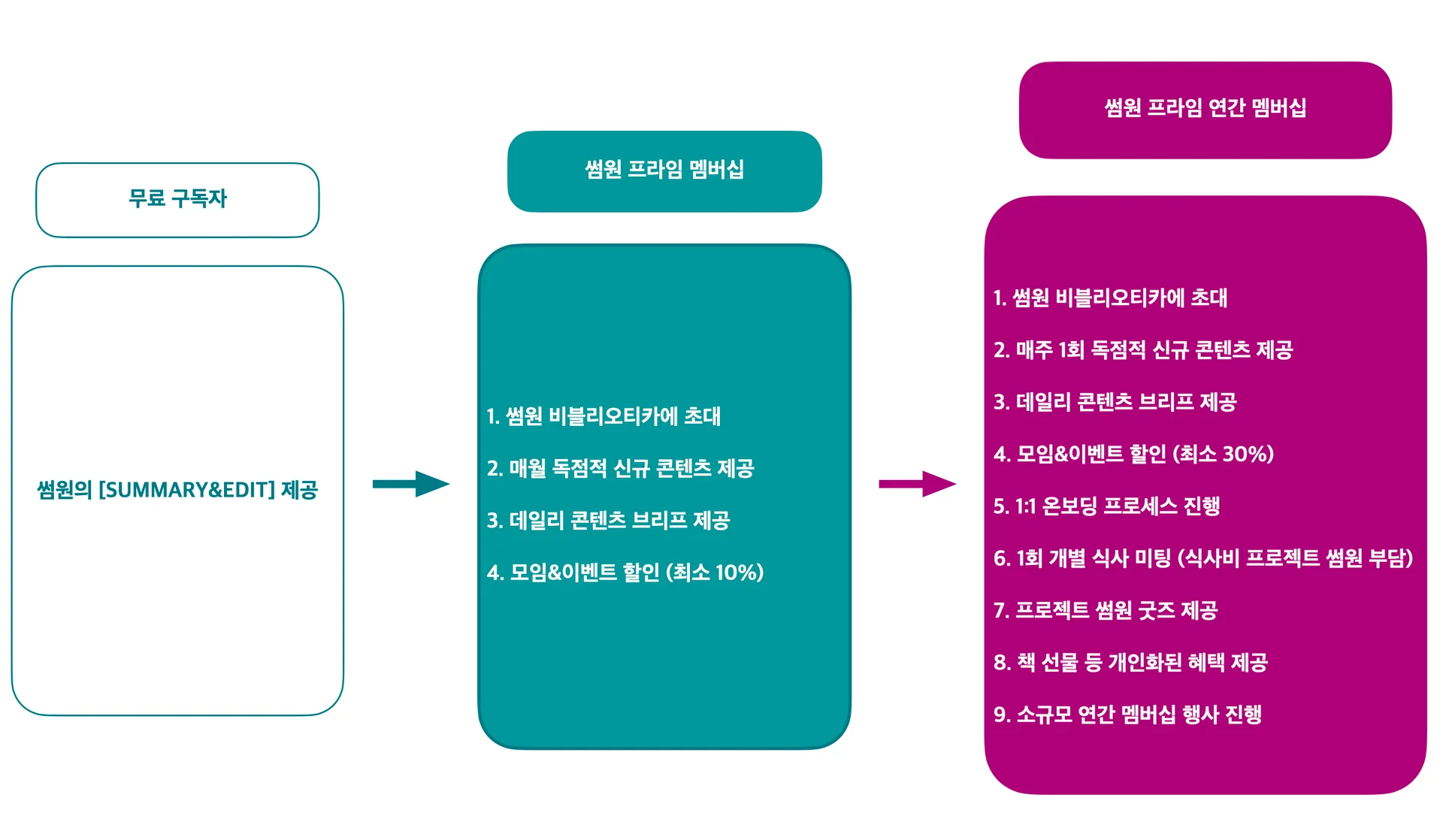 스페셜 레터, 독점 콘텐츠, 다양한 모임 할인, 썸원 아카이브 제공